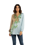 Una delicata decorazione a ramage nei toni del verde smeraldo e terra attraversa il capo, aggiungendo un tocco di lusso artigianale