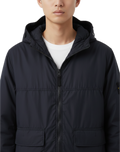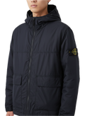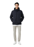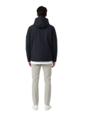 Giacca con cappuccio in tessuto tecnico di nylon a tre strati laminato su una membrana traspirante e resistente all'acqua, dotata di tasche multiple, orlo con coulisse e zip a doppio cursore. Modello tinto in capo con antigoccia.