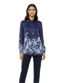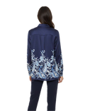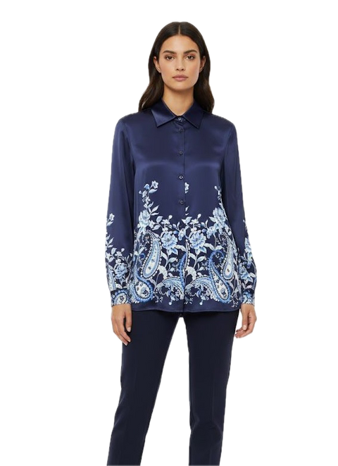 Un ricco fregio floreale e paisley nei toni del celeste, bianco e polvere decora armoniosamente il fondo della camicia e delle maniche, creando un effetto "border print" di grande impatto