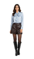 Il dettaglio distintivo del lavallière (fiocco al collo) aggiunge un volume romantico e autorevole