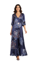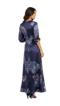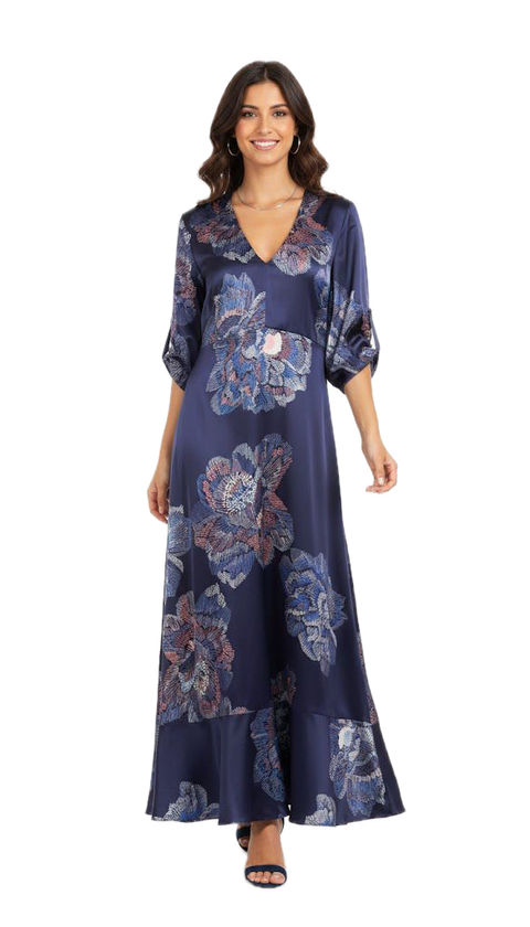 Il design è caratterizzato da grandi fiori stilizzati nei toni del blu polvere, cipria e bronzo, che donano movimento e un carattere contemporaneo al classico abito navy
