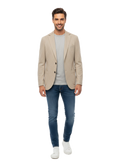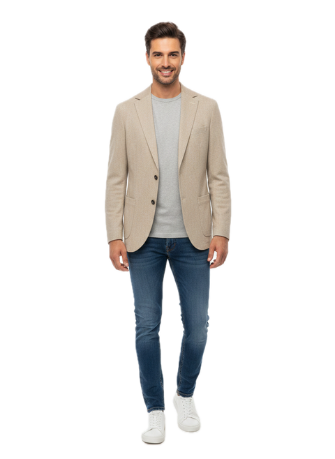 La giacca si distingue per una raffinata trama testurizzata con un motivo micro-disegnato (tipo micro-check o armaturato) che dona profondità e un aspetto sartoriale moderno