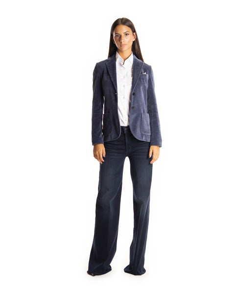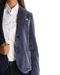 GIACCA VELLUTO - COLORE: BLU JEANS - COMPOSIZIONE: 80% COTONE, 20% POLIESTERE - VESTIBILITÀ: LA MODELLA IN FOTO È ALTA 172CM ED INDOSSA LA TAGLIA 40 - INFORMAZIONI: GIACCA VELLUTO, DETTAGLIO TASCHE, MONOPETTO, DETTAGLIO BOTTONI, DETTAGLIO FAZZOLETTO