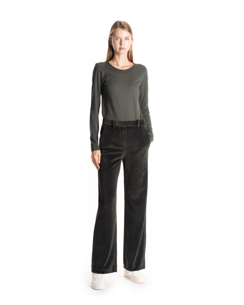 PANTALONE VELLUTO - COLORE: VERDE - COMPOSIZIONE: 80% COTONE, 20% POLIESTERE - VESTIBILITÀ: LA MODELLA IN FOTO È ALTA 178CM ED INDOSSA LA TAGLIA 40 - INFORMAZIONI: PANTALONE MORBIDO, VELLUTO, GAMBA AMPIA