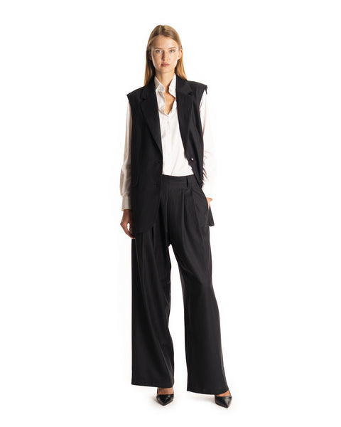 GILET GESSATO - COLORE: NERO BLU - COMPOSIZIONE: 65% POLYESTER, 35% RAYON - VESTIBILITÀ: LA MODELLA IN FOTO È ALTA 178CM ED INDOSSA LA TAGLIA S - INFORMAZIONI: GILET, DETTAGLIO BOTTONI, SCOLLO V