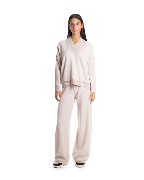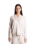 MAGLIA SV BOUCLE - COLORE: GESSO - COMPOSIZIONE: 77% WO, 16% CO, 1% PL, 6% PA - VESTIBILITÀ: LA MODELLA IN FOTO È ALTA 172CM ED INDOSSA LA TAGLIA S - INFORMAZIONI: MAGLIA SV BOUCLE, DETTAGLIO CATENA, DETTAGLIO SCOLLO V