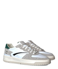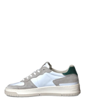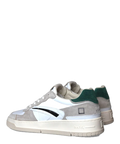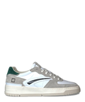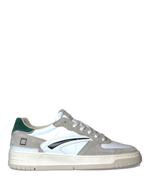 La tomaia in pelle di vitello è valorizzata da inserti in suede e dettagli a contrasto nei toni del bianco e verde, per un’estetica pulita ma distintiva. I lacci in cotone assicurano una calzata confortevole, mentre i loghi laterali e il talloncino in suede firmato D.A.T.E. definiscono l’identità del modello.