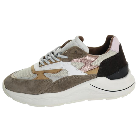 Running sneaker in tessuto tecnico con inserti in suede a contrasto. Dettagli in pelle. Il patch in pelle con logo e scritta D.A.T.E. è cucito sulla linguetta. Il nome FUGA è impresso lateralmente. I lacci sono tondi e il logo quadrato è impresso posteriormente. Il talloncino è in pelle. Fodera in pelle e spugna di cotone. La soletta interna in gel è rialzata di 2.5 cm per un miglior comfort. La suola in gomma blowtech è alta 2 - 5 cm. Tutti i materiali selezionati sono Made in Italy. Calzata stretta.