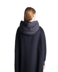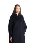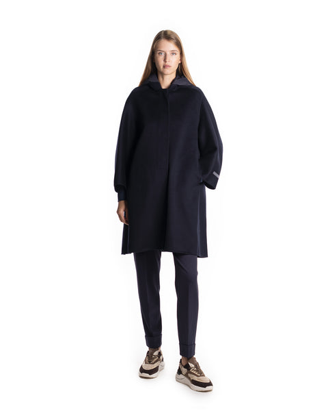 PIUMINO EMILIA - COLORE: BLU - COMPOSIZIONE: 90% LANA VERGINE, 10% CASHMERE - VESTIBILITÀ: LA MODELLA IN FOTO È ALTA 172CM ED INDOSSA LA TAGLIA 42 - INFORMAZIONI: PIUMINO EMILIA, DETTAGLIO CAPPUCCIO, DETTAGLIO TASCHE, DETTAGLIO BOTTONI