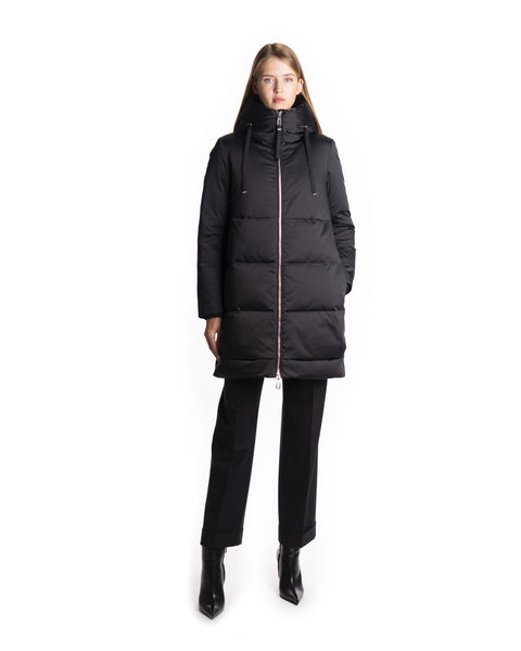 PIUMINO TALIA - COLORE: NERO - COMPOSIZIONE: 100% POLIESTERE - VESTIBILITÀ: LA MODELLA IN FOTO È ALTA 172CM ED INDOSSA LA TAGLIA 40 - INFORMAZIONI: PIUMINO TALIA, DETTAGLIO TASCHE, DETTAGLIO ZIP, DETTAGLIO CAPPUCCIO