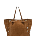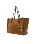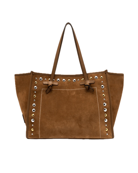 Shopping Marcella by Gianni Chiarini Firenze in pelle scamosciata, con impunture a contrasto e borchie in metallo che le conferiscono un carattere Western. Profili in pelle e design minimal completano il modello. Dotata di manici in pelle, chiusura magnetica e tasca interna con zip, unisce eleganza e praticità. Dimensioni: 38 x 31 x 16 cm.