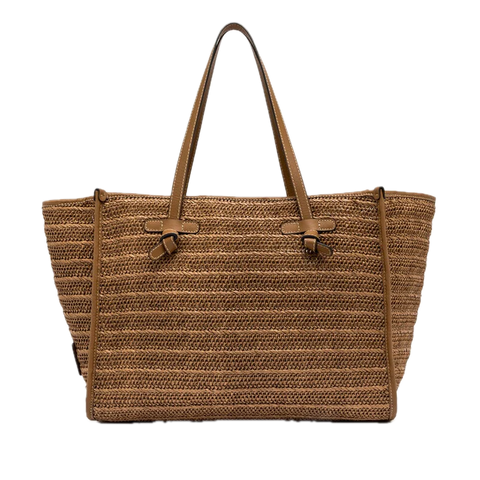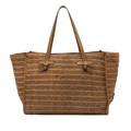 Borsa shopper Marcella di Gianni Chiarini realizzata in paglia intrecciata di colore caramello con profilo in pelle in nuance. Doppi manici sottili da tenere a spalla in pelle tono su tono con chiusura a magnete. Pochette piatta interna chiusa con zip di colore caramello.