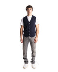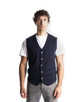 GILET MERINO - COLORE: BLU - COMPOSIZIONE: 100% LANA VERGINE - VESTIBILITÀ: IL MODELLO IN FOTO È ALTO 180CM ED INDOSSA LA TAGLIA 50 - INFORMAZIONI: GILET MERINO, DETTAGLIO BOTTONE, DETTAGLIO TASCHE